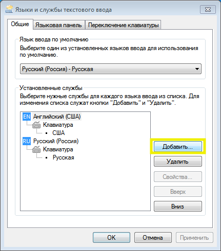Теперь, когда вы в окне "Языки и службы текстового ввода", нажмите "Добавить...", чтобы перейти к окну добавления языков ввода.