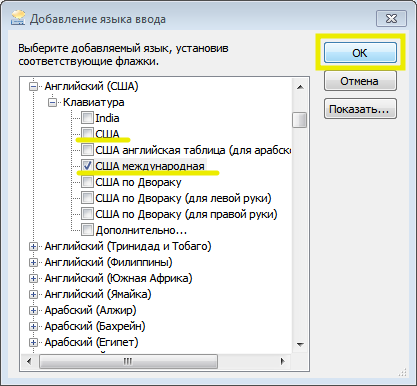 В списке языков ввода, ищем "Английский (США)" и разворачиваем список раскладок. Убираем галочку у раскладки "США" и ставим галочку у "США международная" и нажимаем "ОК", чтобы применить изменения и выйти из этого окна. Таким образом, мы заменили стандартную раскладку США на её международный вариант.