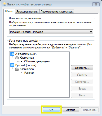 Вернувшись в окно языков и служб текстового ввода, нажимаем "ОК" ещё раз. Мы успешно сохранили конфигурацию раскладок. Панель управления и окно настройки языков и региональных стандартов можно закрыть.